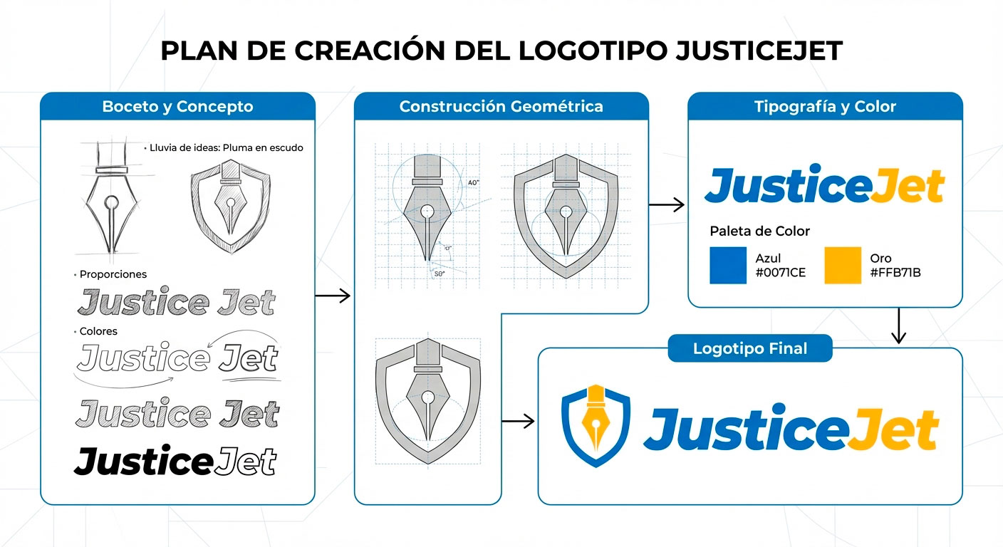 El logo de JusticeJet es el resultado de un proceso creativo meticuloso que combina simbolismo jurídico con diseño moderno. A continuación te explicamos cómo se creó y qué representa.