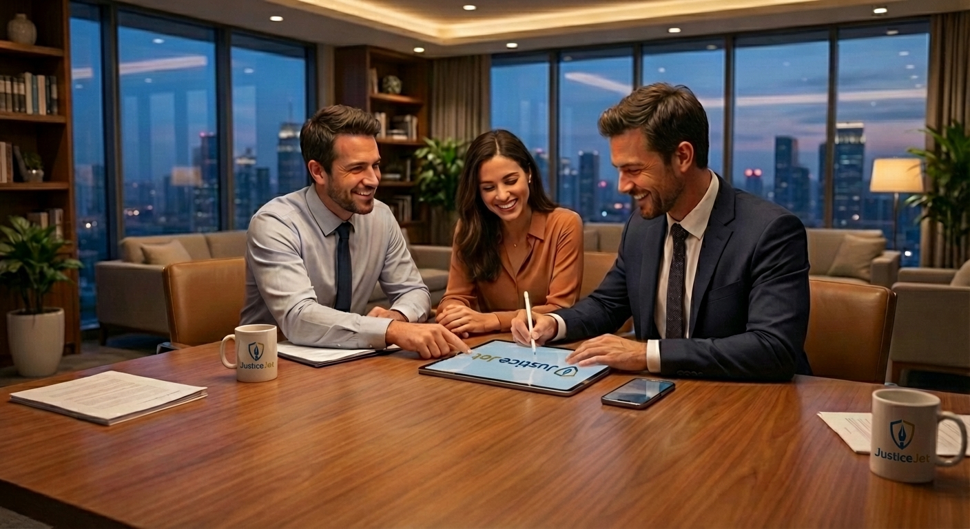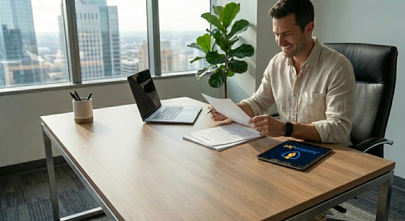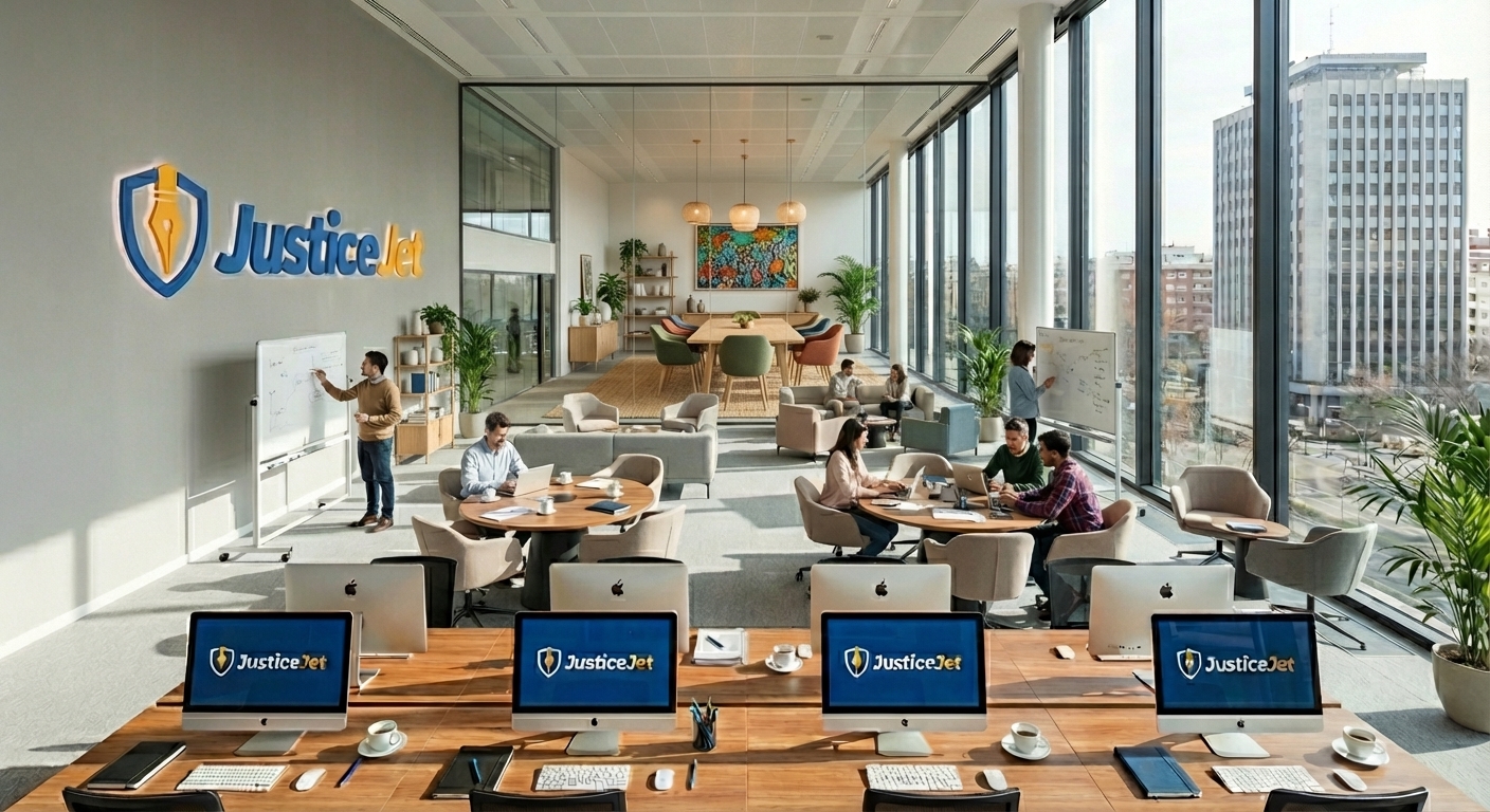 Imagen de un entorno de oficina moderno y profesional. Útil para representar el ambiente corporativo y la presencia física de JusticeJet.