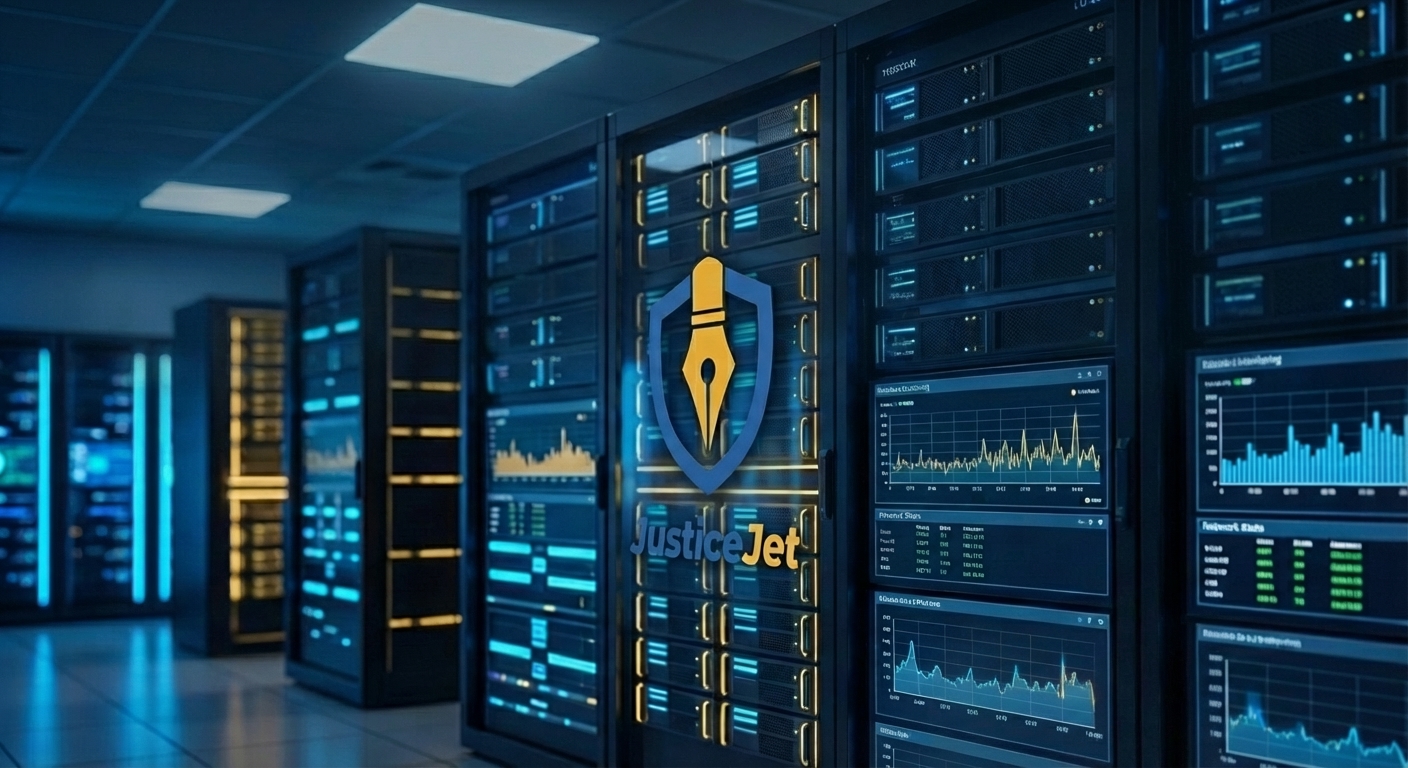 Mockup de servidores y tecnología. Ideal para ilustrar la robustez tecnológica, seguridad y infraestructura que respalda la plataforma JusticeJet.